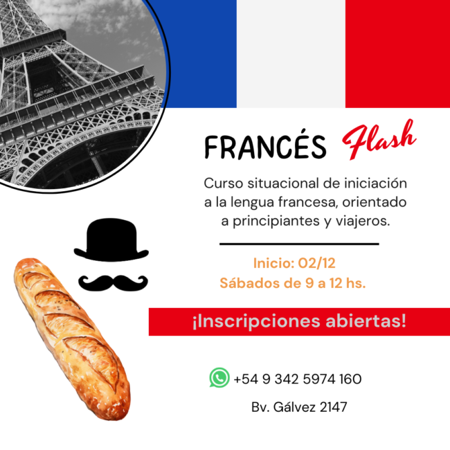 En diciembre, ¡continuamos! Francés FLASH es una propuesta de iniciación a la lengua francesa a partir de situaciones concretas de la vida cotidiana. El curso está orientado a público viajero y principiante; se desarrollará a lo largo de cinco encuentros, los días sábados de diciembre, de 9 a 12 horas. ¡Te esperamos!