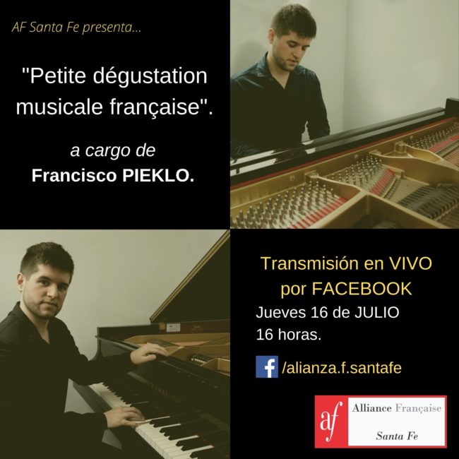 El artista local Francisco Pieklo, ofrecerá un repertorio de composiciones clásicas de la música francesa. Este encuentro musical podrá seguirse en VIVO por el Facebook de la institución f:/alianza.f.santafe Jueves 16/7 – 16 horas. ¡Te esperamos!