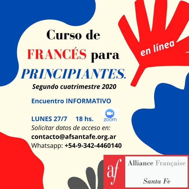 Curso para iniciación a la lengua francesa, a dictarse durante el segundo cuatrimestre 2020. Encuentro informativo: lunes 27/7, a las 18 hs, por ZOOM. Solicitá los datos de acceso en: contacto@afsantafe.org.ar / Whatsapp +-54-9-342-4460140 Te esperamos!!!