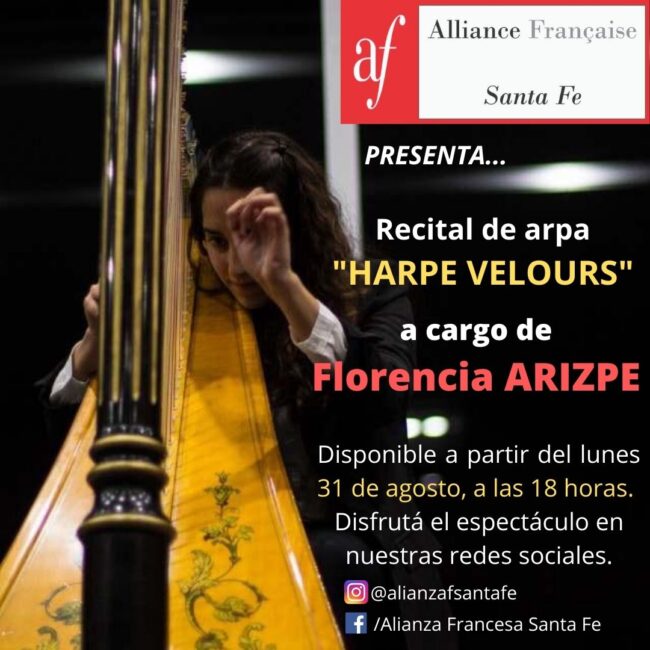 La artista local Florencia ARIZPE comparte con nosotros su talento con el arpa. El próximo lunes 31 de agosto, a partir de las 18 horas, tendremos disponible el vídeo de su espectáculo de arpa titulado «Harpe Velours». La emisión se realizará por nuestras redes sociales. No te lo pierdas!