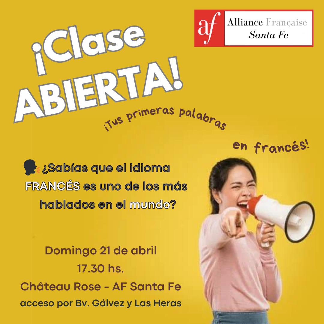 La AF Santa Fe invita a la Comunidad al evento «Clase ABIERTA: tus primeras palabras en francés». La actividad se llevará a cabo el próximo domingo 21 de abril, a las 17.30 horas, en el Château Rose de la institución.