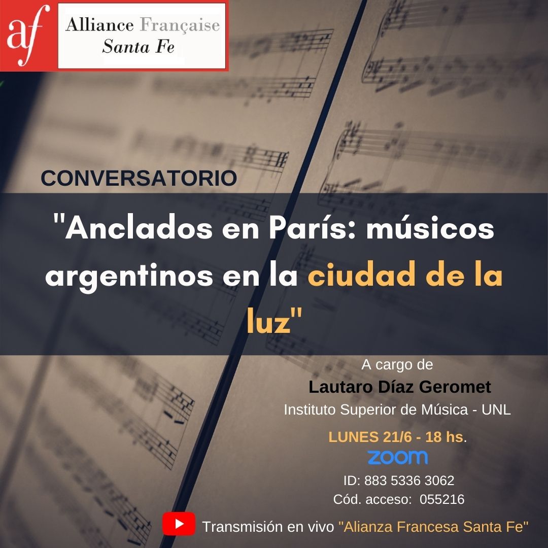 En el marco de las actividades por el día internacional de la música, la AF Santa Fe invita al conversatorio que abordará la incidencia de algunas figuras de la música argentina que tuvieron relación con Francia (con París concretamente). Los interrogantes, ¿Qué hicieron en Francia?, ¿Por qué fue importante para ellos y para la música argentina?, ¿Qué impacto tuvo esa estadía en la carrera de ellos?, entre otros, orientarán la exposición a cargo del prof. Lautaro Díaz Geromet (ISM-UNL).