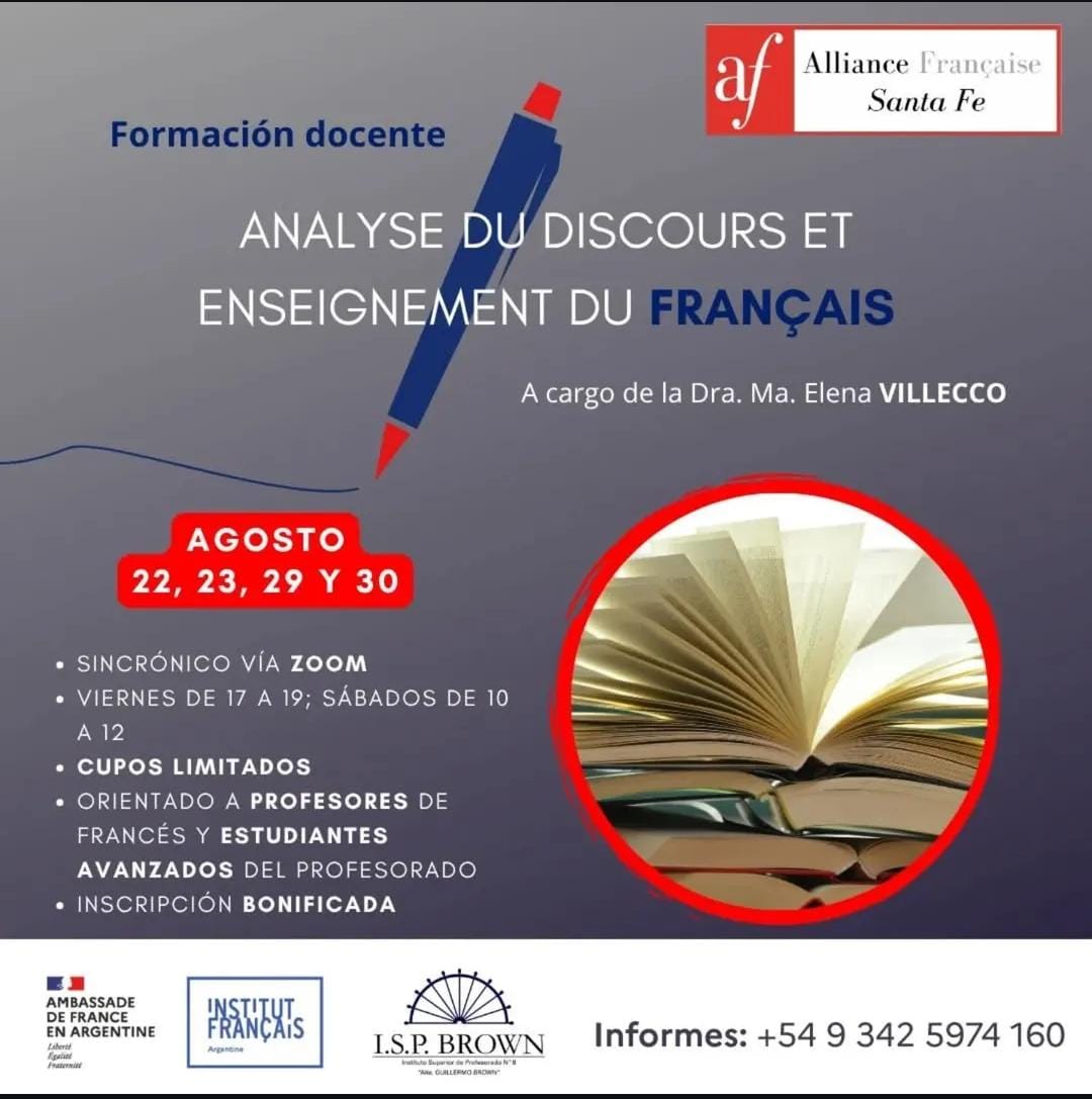 La Alianza Francesa de Santa Fe 🇨🇵 te invita a participar de la formación a cargo de la Dra. Ma. Elena Villecco «Analyse du discours et enseignement du Français» , gentileza del Instituto Francés de Argentina y de la Embajada de Francia en Argentina.