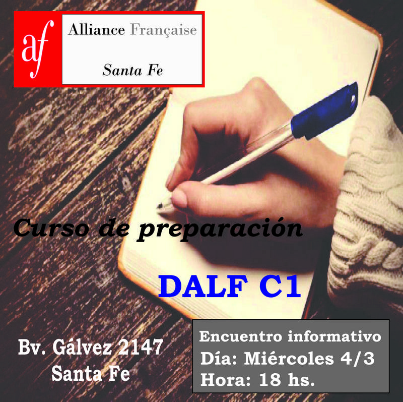 La AF Santa Fe convoca a todos los interesados en comenzar a preparar el examen DALF C1 al encuentro informativo, que se llevar谩 a cabo en el local de la instituci贸n, el mi茅rcoles 4 de marzo, a las 18 horas.