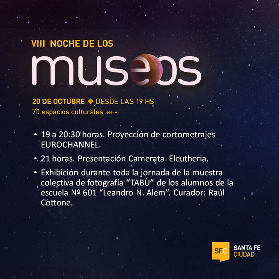 La AF Santa Fe participar谩 de la VIII edici贸n de la Noche los museos. Los esperamos para compartir con ustedes la propuesta cultural que ofrece la instituci贸n para esa ocasi贸n.